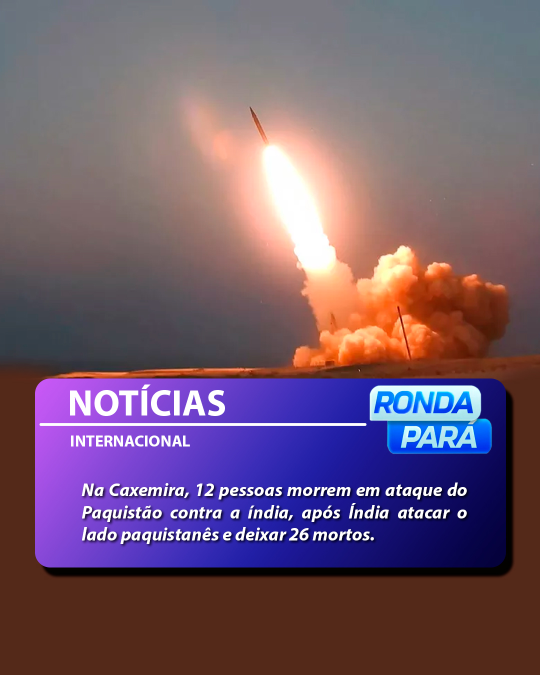 Ataque do Paquistão na região da Caxemira controlada pela Índia deixou 12 mortos e ao menos 38 feridos nesta quarta-feira (7), segundo autoridades locais, ofensiva ocorre após o Paquistão afirmar que revidaria os ataques indianos desta terça-feira (6). A Índia confirmou ter atacado nove alvos paquistaneses, companhias aéreas asiáticas mudaram rotas e cancelaram voos que passavam pelo local, 52 voos para o Paquistão foram cancelados.